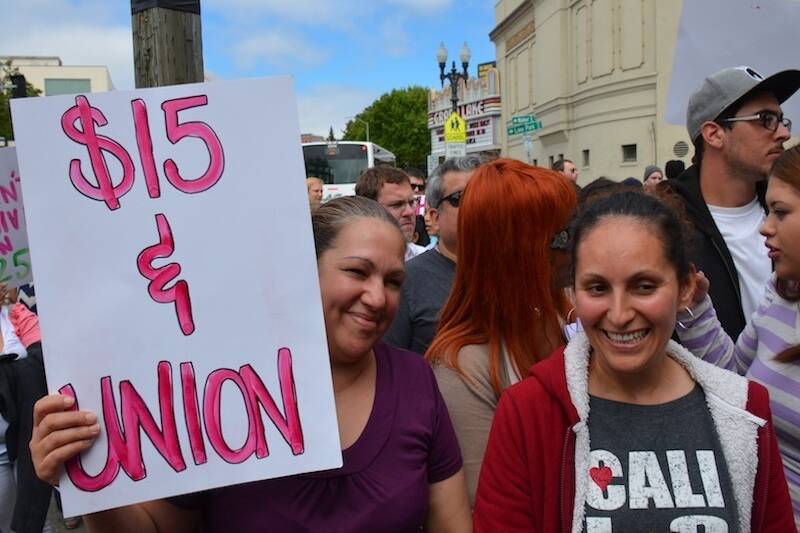 Emeryville’s living wage initiative has implications that extend far beyond the city’s two square miles. At an April 15 rally in Berkeley, Mayor Atkin told hundreds of fast food workers, adjunct professors, union organizers and activists about the “fight for human decency” in her city. The rally was staged in conjunction with the national, 200-city Fight for $15 protest on tax day. Organizers called the event the largest demonstration of low-wage workers in U.S. history.
